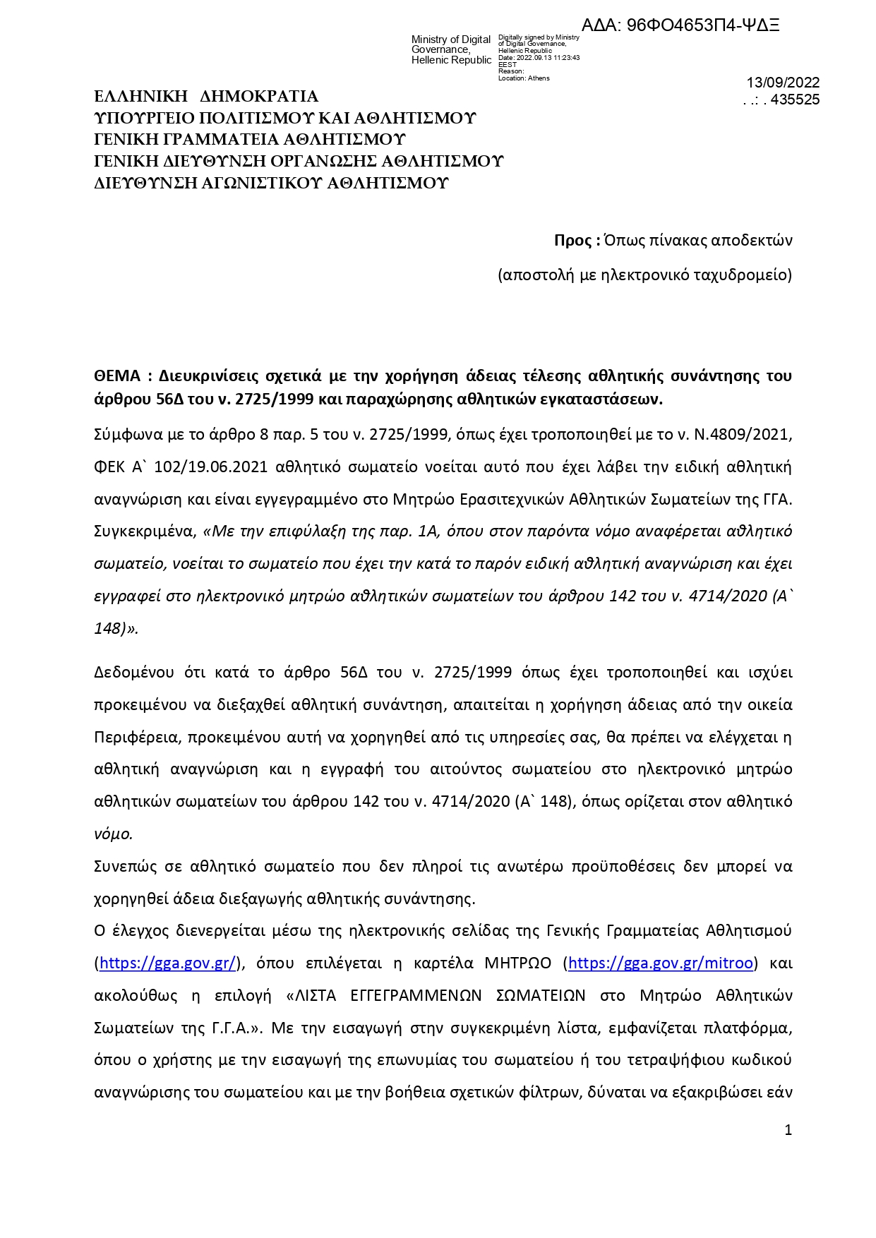 Το Υπουργείο Αθλητισμού εξέδωσε διευκρινιστική εγκύκλιο με τίτλο «Διευκρινίσεις σχετικά με την χορήγηση άδειας τέλεσης αθλητικής συνάντησης του άρθρου 56Δ του ν. 2725/1999 και παραχώρησης αθλητικών εγκαταστάσεων».